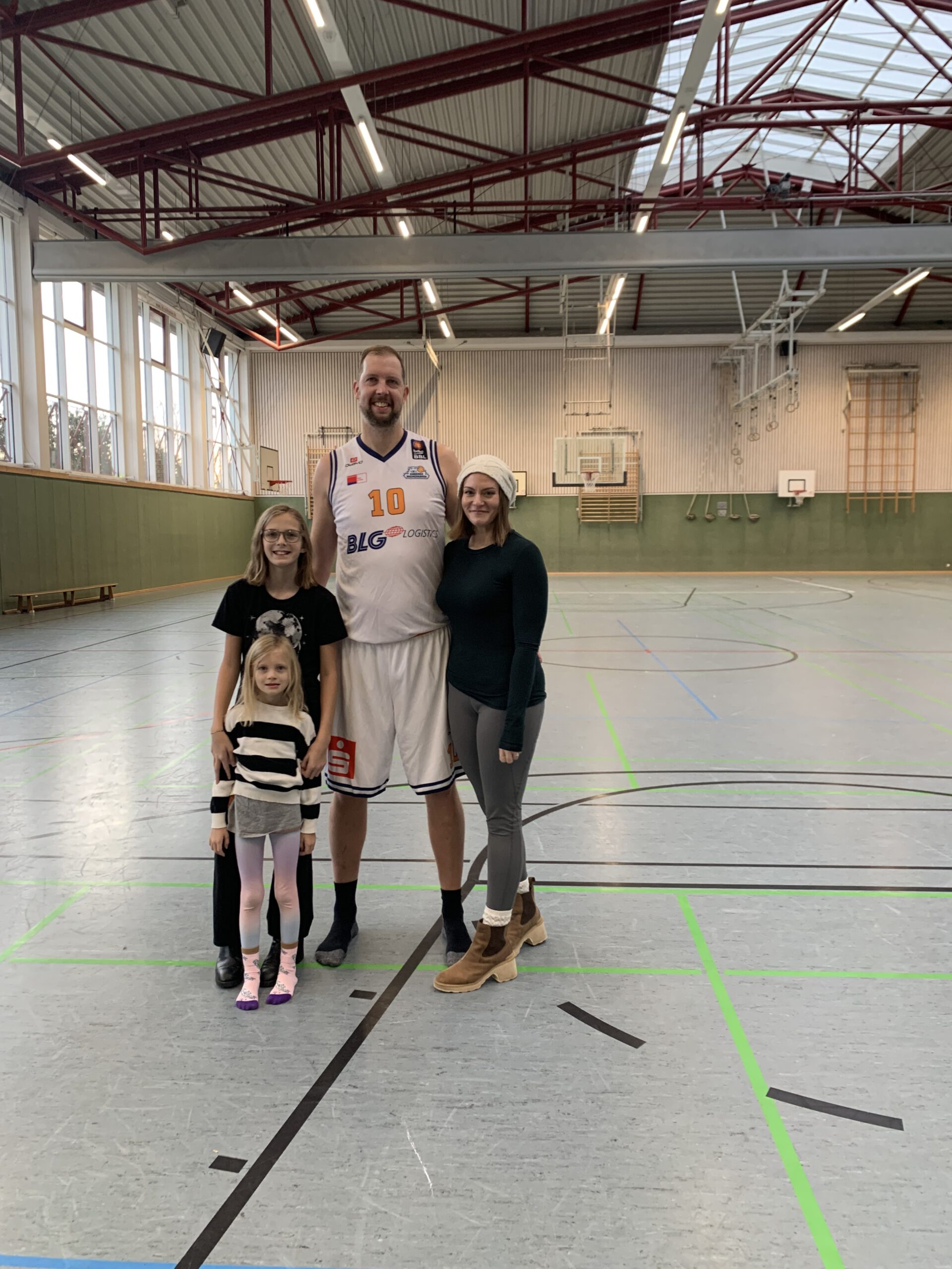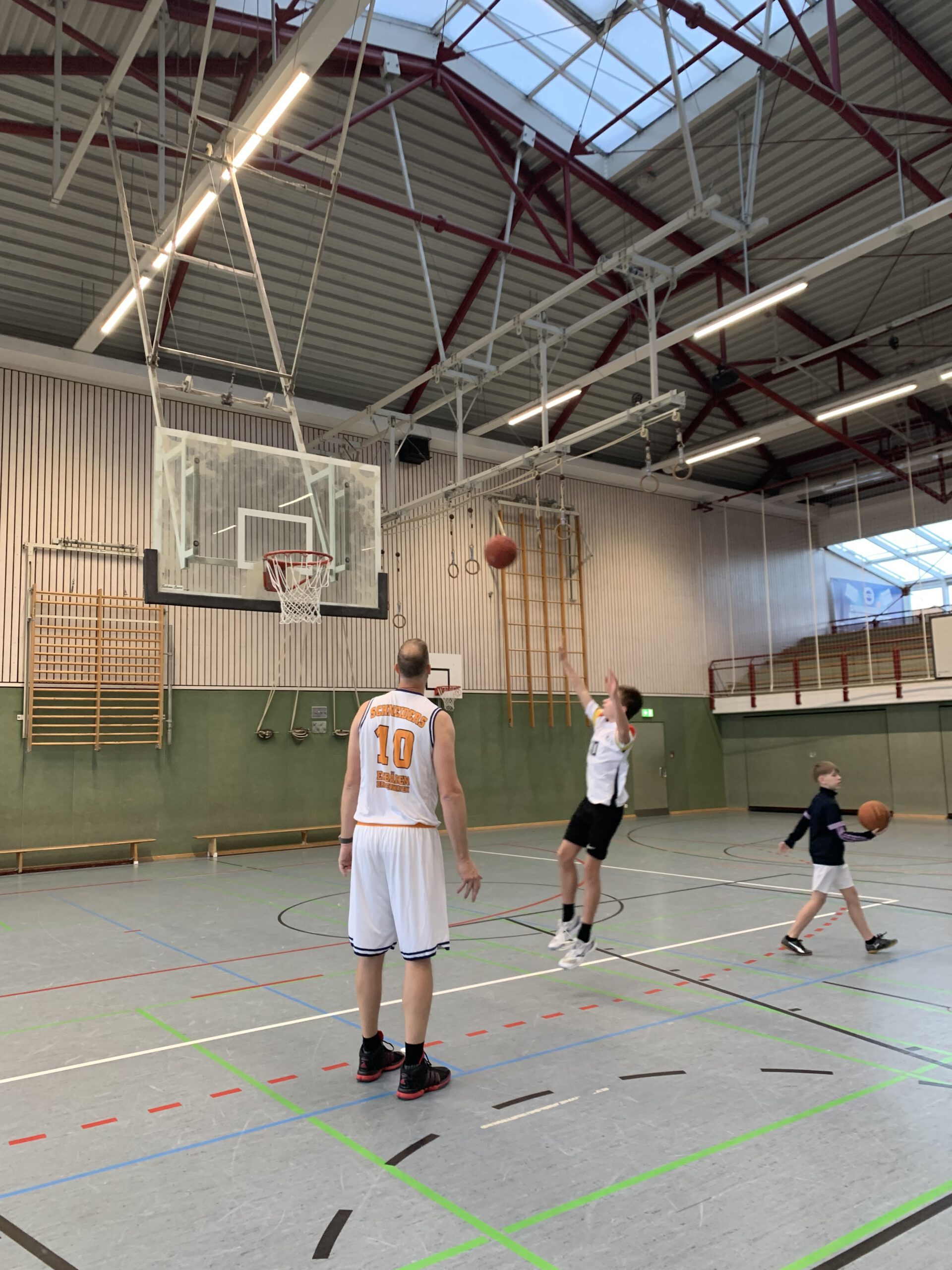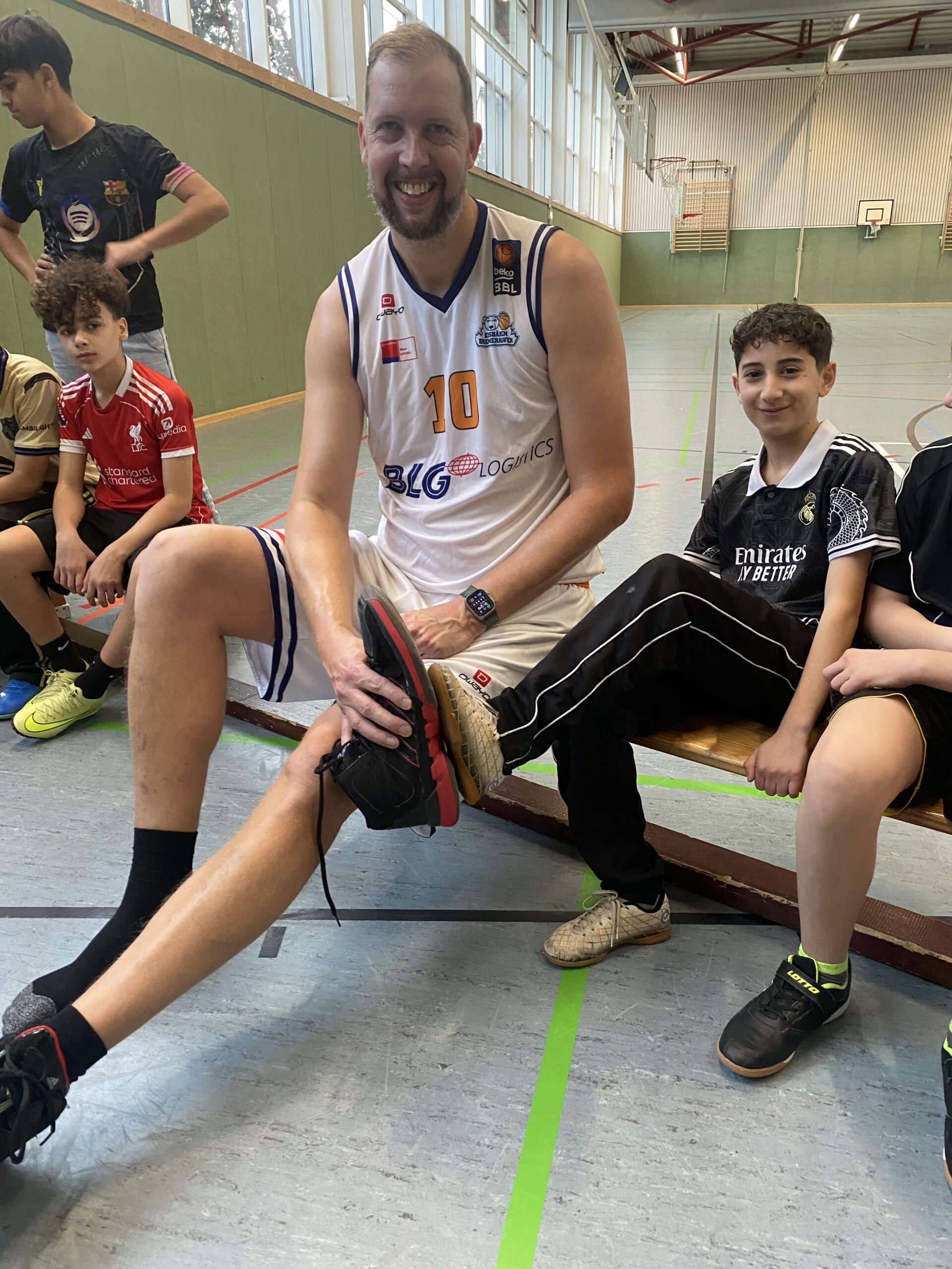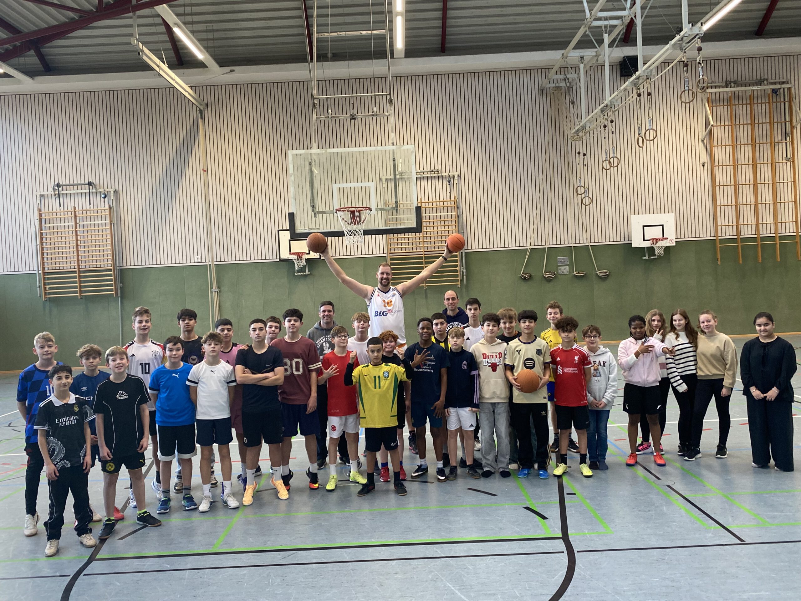 Im praktischen Teil der Stunde ging es anschließend auf den Basketballcourt. Gemeinsam mit den Schülerinnen und Schülern arbeitete Nick Schneiders an grundlegenden Techniken wie Dribbeln, Passen und Korblegern. Natürlich durfte auch ein kleines Turnier nicht fehlen. Schneiders war dabei mit vollem Engagement auf dem Feld und sorgte mit seiner offenen Art für eine mitreißende Atmosphäre. Die Schülerinnen und Schüler zeigten sich begeistert davon, einmal gemeinsam mit einem ehemaligen Profisportler zu spielen. Trotz teils deutlicher Größenunterschiede hatten alle Beteiligten sichtlich Spaß, kamen ordentlich ins Schwitzen und erlebten den Sport auf besondere Weise.