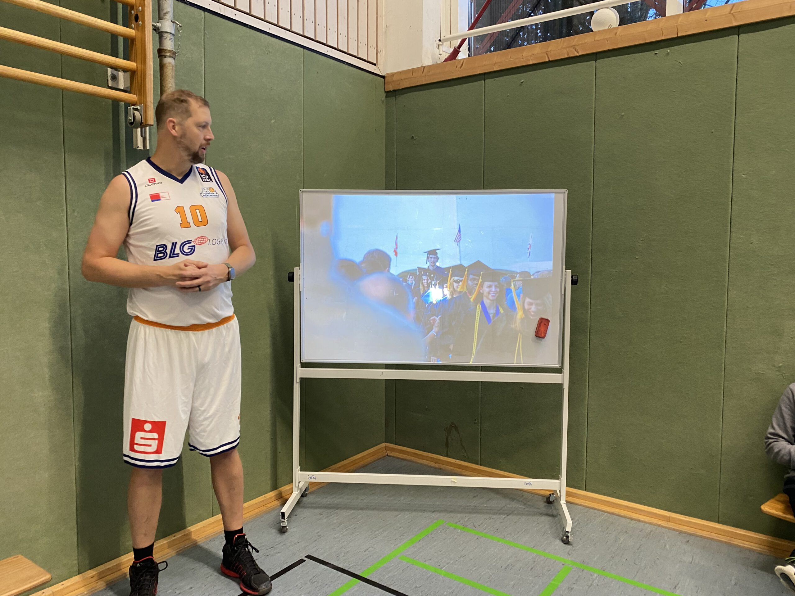 Zu Beginn der Unterrichtsstunde nahm sich Schneiders bewusst Zeit, den Jugendlichen von seinem persönlichen Lebens- und Berufsweg zu berichten. Dabei spannte er den Bogen von seiner eigenen Schulzeit an der damaligen Realschule in Rietberg über seine akademische und sportliche Laufbahn bis in seine heutige Lebenssituation. Besonders eindrucksvoll schilderte er seine Zeit als Student und Basketballspieler am amerikanischen College der University of South Carolina Upstate, wo er Studium und Leistungssport miteinander verbinden konnte. Durch Bilder aus der damaligen Zeit wurden die Berichte von Nick zusätzlich veranschaulicht. Nach seiner Rückkehr nach Deutschland spielte Schneiders mehrere Jahre als Basketballprofi in der ersten und zweiten Bundesliga, bevor er sich erneut für einen Umzug in die USA entschied. Dort lebt er inzwischen seit knapp zehn Jahren, hat eine Familie gegründet und ist Vater von zwei Kindern. Die offenen und authentischen Einblicke machten deutlich, wie vielfältig und nicht immer geradlinig berufliche Wege verlaufen können.
