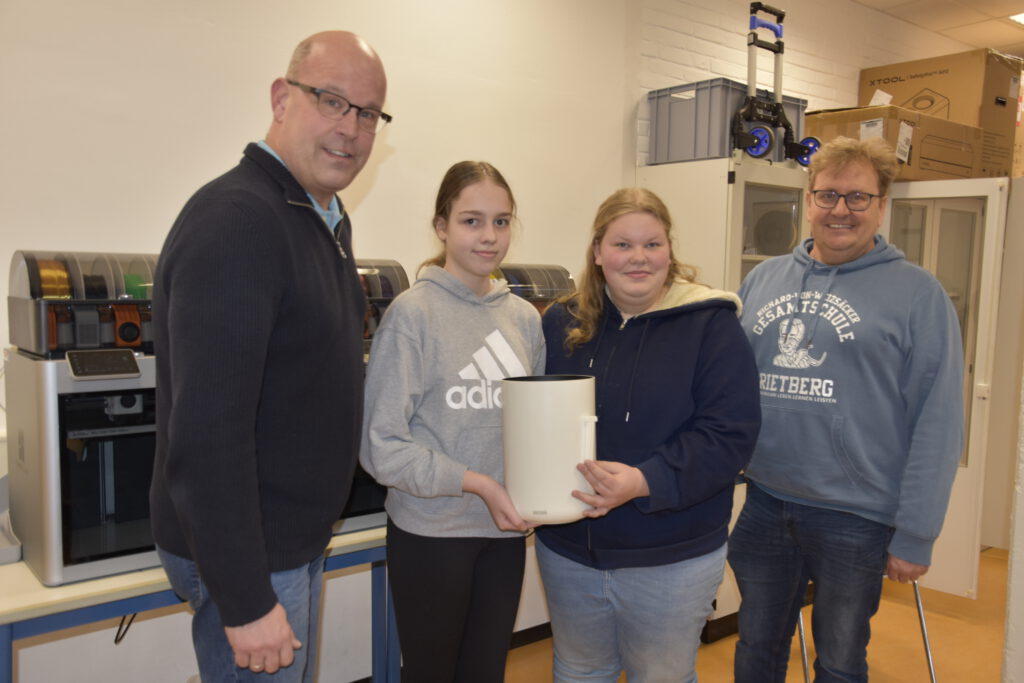 Gemeinsam mit dem Fachlehrer Sven Thöne ging es ans Planen, Ausprobieren und Tüfteln. Ziel war es, mithilfe des 3D-Druckers eine funktionale und stabile Halterung zu entwerfen. Nach mehreren Entwürfen und Testdrucken gelang schließlich den Schülerinnen Anna-Lena Heitmeyer und Emilie Schulte-Döinghaus die überzeugendste Lösung, die sie stolz übergeben konnten.