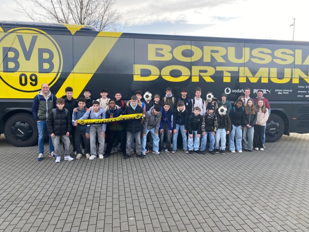 Die Schülerinnen und Schüler der Gesamtschule Rietberg, die seit diesem Schuljahr das Fach Sport als Hauptfach erleben dürfen, verbrachten am Donnerstag einen spannenden Tag in Dortmund. Im Rahmen der Berufsorientierung waren die WPI-Sportkurse von Jan Martin und Daniel Jürgens zu Gast bei Borussia Dortmund und erhielten spannende Einblicke in den BVB als Arbeitgeber und Ausbildungsbetrieb.